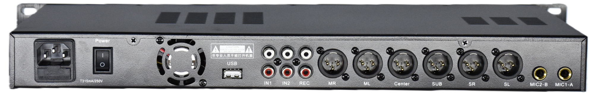 2路话筒输入通道处理;3级3级反馈抑制,并可选择OFF/ON; 音乐有2路立体声RCA输入BGM和VOD,1路REC录音输出。